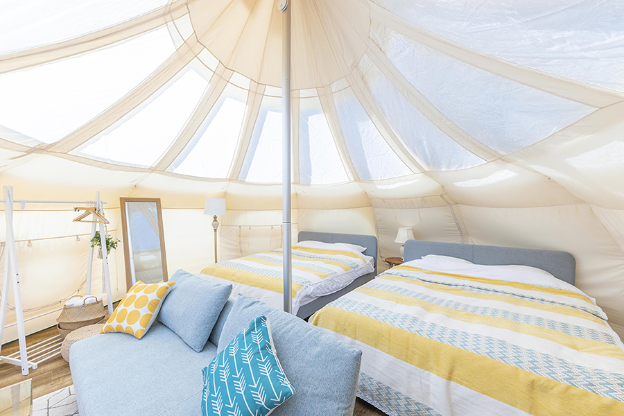 ドームテントは全9棟。5棟はクイーンベッド2台。4棟はシングルベッド4台のご用意となります。各棟への割り振りはご利用人数などご予約内容を考慮して部屋割りをさせていただきます。確定ではございませんがベッドの種類のご希望ございましたらご予約時に要望欄にご記載ください。